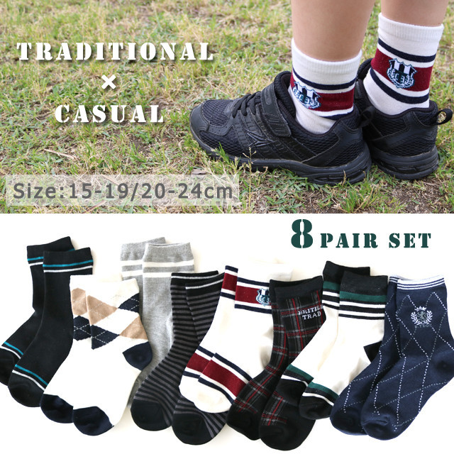 靴下 キッズ 男の子 トラッドカジュアルがかっこいい 定番のラインソックスやアーガイルなど オシャレキッズに 通園 通学 お遊戯会 クルー丈 8足セット 15 19cm 24cm 対応送料無料